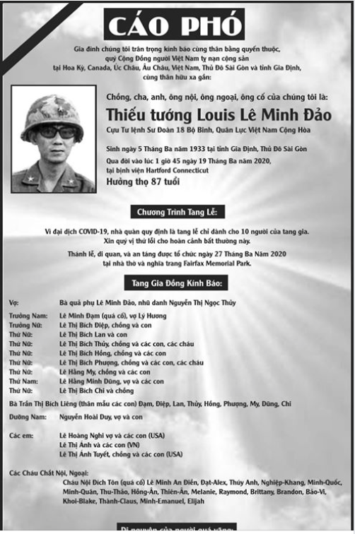 CÁO PHÓ Thiếu Tướng Louis LÊ MINH ĐẢO