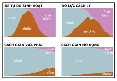 Nếu để bình thường, không cách ly, không cách giãn, các ca nhiễm sẽ lên tột đỉnh (hình chuông nâu), rồi giảm dần theo thời gian. Dĩ nhiên, trong thời gian này, số người tử vong sẽ rất cao, theo các mô phỏng của các nhà khoa học trình bày ở trên. Nếu có “nỗ lực cách ly,” số ca nhiễm vẫn còn cao. Chỉ cần áp dụng sự “cách giãn vừa phải,” tình trạng tử vong sẽ giảm nhiều. Nếu áp dụng sự “cách giãn mở rộng,” như áp đặt tình trạng thiết quân luật tại Vũ Hán, tình trạng lây lan rất thấp, dẫn đến tỷ lệ tử vong cũng rất thấp. Đây là tình trạng tốt nhất mà người dân cần hiểu biết và áp dụng.