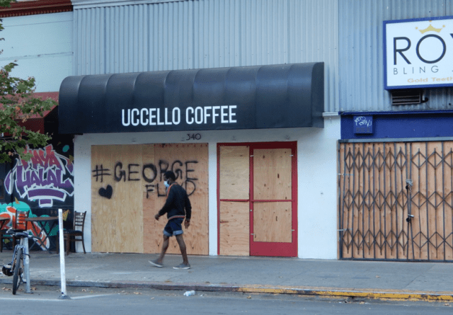Trong khu thương mại vùng Vịnh San Francisco bây giờ các cửa hàng đều có ván ép bao bọcvì không biết khi nào sẽ có bạo động xảy đến.