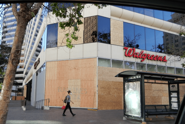 | Tiệm Walgreens đã bị phá và hôi của trong đêm Chủ Nhật 31/5/20 (Ảnh: Bùi Văn Phú) |