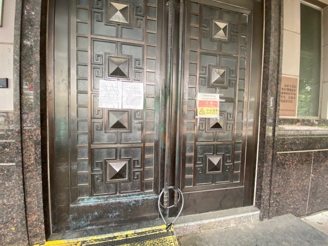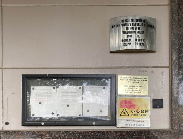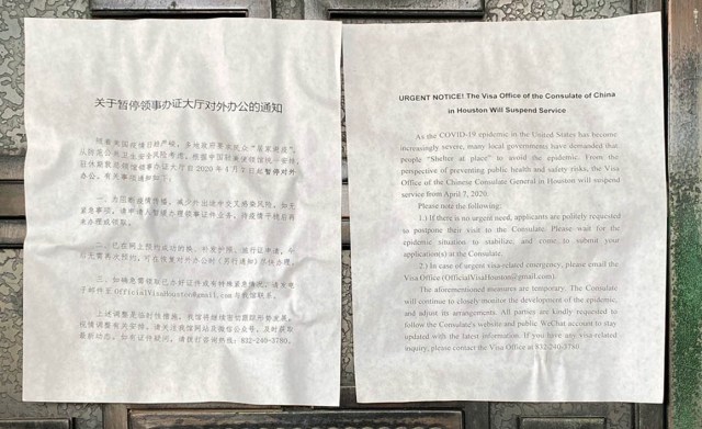 Tuy nhiên từ sáng sớm thứ Sáu, trước cổng chính của Lãnh sự quán đã dán thông báo đóng cửa với lý do “Khi dịch COVID-19 ở Hoa Kỳ ngày càng trở nên nghiêm trọng, nhiều chính quyền địa phương đã yêu cầu mọi người ‘trú ẩn tại chỗ’ để tránh dịch. Từ góc độ phòng ngừa rủi ro về an toàn và sức khỏe cộng đồng, Văn phòng Visa của Tổng lãnh sự quán Trung Quốc tại Houston sẽ dừng dịch vụ từ ngày 7 tháng 4 năm 2020” (As the COVID-19 epidemic in the United States has become increasingly severe, many local governments have demanded that people “shelter at place” to avoid epidemic. From the perspective of preventing public health and safety risks, the Visa Office of the Chinese Consulate General in Houston will be suspend service from April 7, 2020).