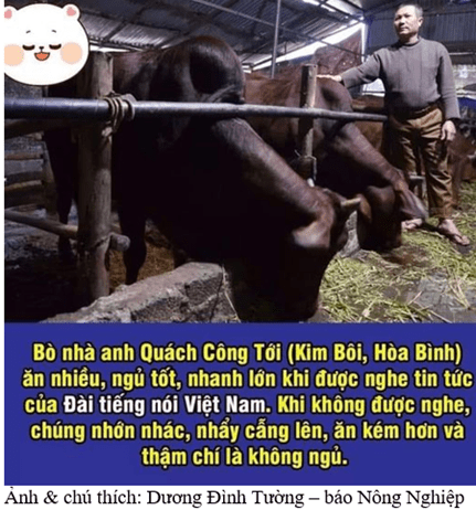 Lúc đầu chúng tôi treo đài vào chuồng bò để vừa làm việc vừa nghe cho đỡ buồn nhưng rồi thấy chúng cũng thích nghe, đặc biệt là tin tức của VOV. Nếu bật đài thì bò vừa ăn vừa nghe, nhai hết cả các thân cỏ kể cả cứng, ngủ nghỉ rất đều còn không bật thì nhớn nhác, nhẩy cẫng lên, ăn kém thậm chí là không ngủ.”