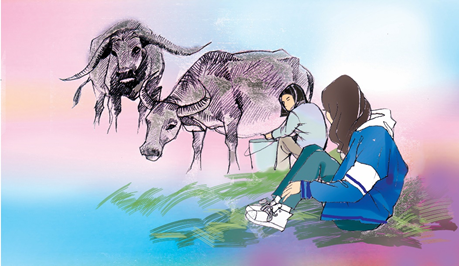 Giang nhìn vào đôi mắt loang loáng kia, từ mắt nó, chẩy dài những dòng lệ. Hình như con trâu đang khóc. Dòng nước mắt ấy khiến Giang xao xhuyến băn khoăn. Lòng cô nhói lên một niềm thương cảm. …