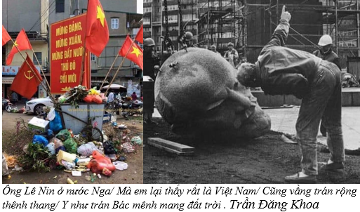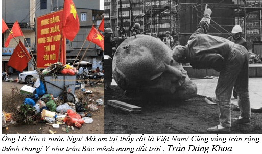 Ông Lê Nin ở nước NgaCớ sao lại đứng vườn hoa nước nàyÔng vênh mặt, ông chỉ tay:Tự do hạnh phúc chúng mày còn xaKìa xem gương của nước NgaBảy mươi năm lẻ có ra đếch gì!