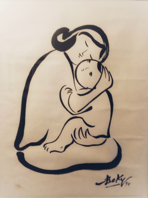 Mỗi lần tôi đi ra đi vào căn buồng nhỏ của em bé, nhìn bức tranh “Mẹ Con” của Bé Ký treo trong đó, không lần nào là tôi không khựng lại, nhớ đến mẹ tôi, đến chính mình, và con của mình.Tôi cứ tưởng tượng ra trong đầu khi họa sĩ hạ cọ xuống những nét vẽ xoay tròn trong tranh chắc chị xoay cả cái tình mẫu tử trong chị vào những giọt mựcđó, chị đã hà tình mẫu tử vào nét cọ chị hạ xuống, thì những người xem tranh chị như tôi mới có được sự rung động dội ngược vào hồn mình khi xem tranh. Cái thông điệp về tình mẫu tử chị gửi ra cho mọi người không đánh trống khua chiêng, không phải viết thành một cuốn sách trăm trang, nó chỉ là một nét vẽ mảnh mai nhưngthực sự nó là một vệt dầu loang trong hồn ta, nó cứ loang xa, loang xa… và ở lại mãi mãi.