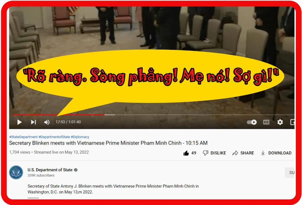 Ngày 13 tháng 5, 2022, một clip video bỗng chốc trở nên “vai-rô” trên khắp các mạng xã hội. “Rõ ràng, sòng phẳng! Mẹ nó! Sợ gì!“. Phát biểu đầy “khí thế” của ông Phạm Minh Chính – thủ tướng nhà nước Việt Nam Cộng Sản trước cuộc gặp gỡ Ngoại Trưởng Antony Blinken – được phát ra từ trang YouTube của Bộ Ngoại Giao Hoa Kỳ.