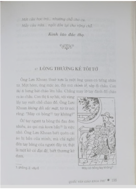 Từ Quốc văn Giáo khoa thư, chúng tôi học được tấm lòng khoan nhu của người trên đối với kẻ dưới. Ông Lưu Khoan mặc phẩm phục đại thần chuẩn bị vào triều, cô thị tì bưng bát cháo lên, lỡ tay đổ cháo vào áo, run lẩy bẩy, đợi chờ một cơn thịnh nộ, song vị quan họ Lưu vẫn không đổi sắc mặt, nhỏ nhẹ nói rằng “mày có bỏng tay không?”