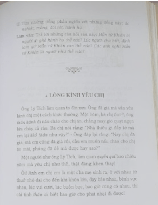 Quốc văn Giáo khoa thư, đó là câu chuyện hiếu đễ của ông Tử Lộ, nhà nghèo, hàng bữa phải đi đội gạo thuê để lấy tiền nuôi cha mẹ già, là câu chuyện ông Lý Tích, làm quan to, bà chị bị bệnh, ông tự mình đi nấu cháo cho chị, lửa táp cháy cả bộ râu, chị hỏi rằng “nhà thiếu gì đầy tớ, sao em lại khổ thân như vậy?”, ông đáp rằng “Nay chị đã già, mà em cũng đã già rồi, dẫu em muốn nấu cháo cho chị ăn mãi, phỏng đã dễ mà được hay sao?”. Tình nghĩa chị em thật cảm động!