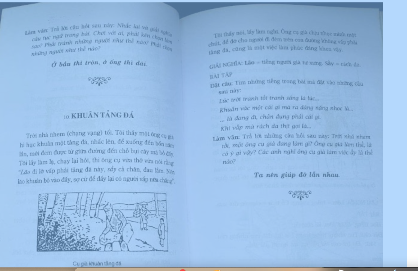 Một trong những đề mục chúng tôi được dạy nhiều nhất là cách hành xử ở đời, theo cái cách mà các nhà giáo dục thời nay vẫn ra rả gọi là “mình vì mọi người”. Chuyện kể về một buổi trời nhá nhem tối, ông lão vô danh hì hục năm lần bảy lượt mới khuân được tảng đá từ giữa đường vào ven đường. Hỏi vì sao làm thế, lão trả lời rằng mình vừa vấp tảng đá này, cố khuân vào chỗ khuất để nhiều người khác không vấp như lão!