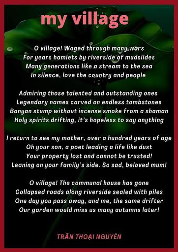 cho đến nay tôi vẫn chưa in được thi phẩm nào để tặng thi hữu thân thiết, nhưng qua ánh mắt xanh NĐH như đột nhất điểm khai thông toàn diện, chỉ qua bài thơ ngắn LÀNG QUÊ TÔI nầy! Bài thơ cũng liền được Nữ sĩ trẻ tài hoa Võ Thị Như Mai đã dịch sang thơ Tiếng Anh với Thi Ảnh đẹp!