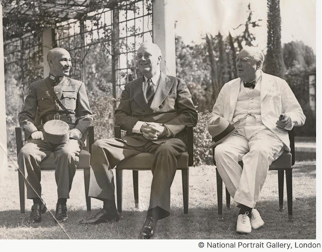 | Tưởng Giới Thạch, Franklin D. Roosevelt và Winston Churchill tại hội nghị ngày 25 tháng 11 năm 1943. Nguồn: National Portrait Gallery London |