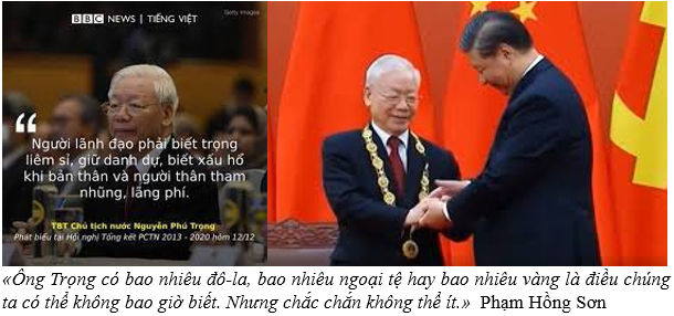Thế nhưng ở Việt Nam chúng ta, các tay lãnh tụ của đảng cộng sản – những kẻ cầm quyền độc quyền và độc đoán suốt ¾ thế kỷ qua – luôn tỏ vẻ tuyệt đối trong sạch. Gần đây, Nguyễn Phú Trọng còn luôn có bộ mặt và giọng điệu rất kẻ cả trong việc răn dạy đồng đảng, xã hội về liêm khiết, trong sạch của người có quyền, có chức. Y cũng chính là người đã khai mở « đốt lò », « chống tham nhũng không có vùng cấm » với những vụ án bỏ tù cả ủy viên bộ chính trị – một việc chưa từng có.