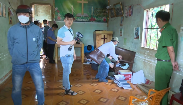 | Công an đến tịch thu lịch và kinh thánh của Hội thánh Tin lành tại làng Buôn Čuôr Knia tháng 4/2023. |