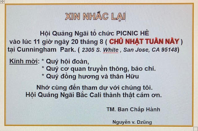 HỘI QUẢNG NGÃI XIN NHẮC LẠI NGÀY TỔ CHỨC PICNIC