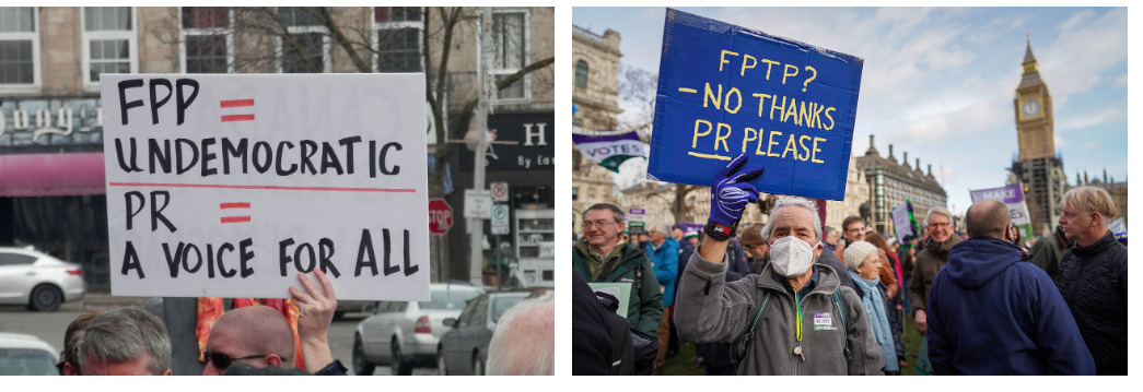 Trái: Hình chụp tại Ngày hành động toàn quốc vì Cải cách bầu cử (National Day of Action for Electoral Reform) 11 tháng 2 năm 2017, trước văn phòng của Lloyd Longfield tại Guelph, Ontario, Canada. Phải: Hình chụp bên ngoài Quốc hội Anh ngày 5 tháng 2 năm 2022.