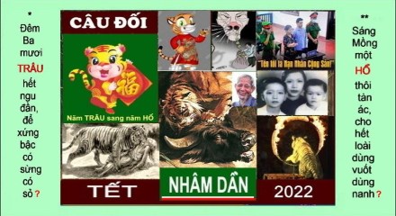 Câu đối Tết Tân Sửu 2021 <A>Hà Sĩ Phu (Danlambao)Lại khóc lại cười với TrâuThấm thoắt đã lại đến Tết con Trâu.Lạ thật, sao con Trâu lại đi ngay sau con Chuột? Một anh “nhỏ bằng cái nhắt”, khôn lỏi, “chúa thằn lằn” về khoản mẹo vặt và lừa đảo, lúc luồn sâu lúc leo … Tiếp tục đọc