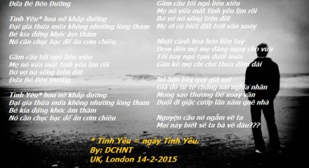 Đứa Bé Bên Đường Tình Yêu* hoa nở khắp đường Đại gia thừa mứa không nhường lòng tham Bé kia đứng khóc âm thầm Nó cần chục bạc để ăn cơm chiều Gầm cầu tối ngủ liêu xiêu Mẹ nó vừa mất tình yêu lịm rồi Bơ vơ nó sống trên đời Mẹ ơi … Tiếp tục đọc